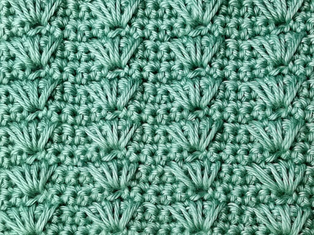 For this crochet stitch you should know how to make a single crochet, a double crochet and a front post double crochet. The crossed ripple stitch is a repeat of two rows. The fabric has a lovely texture.