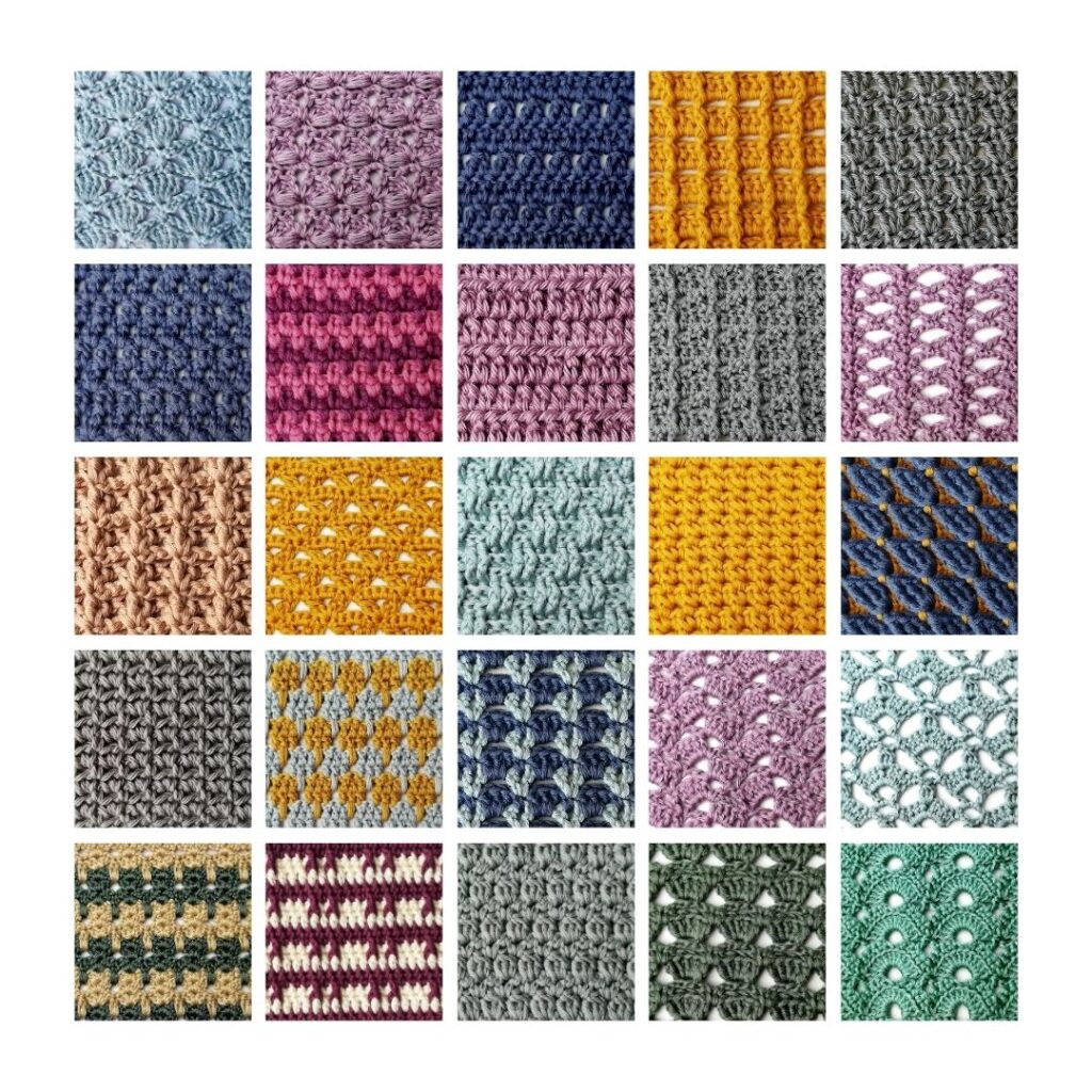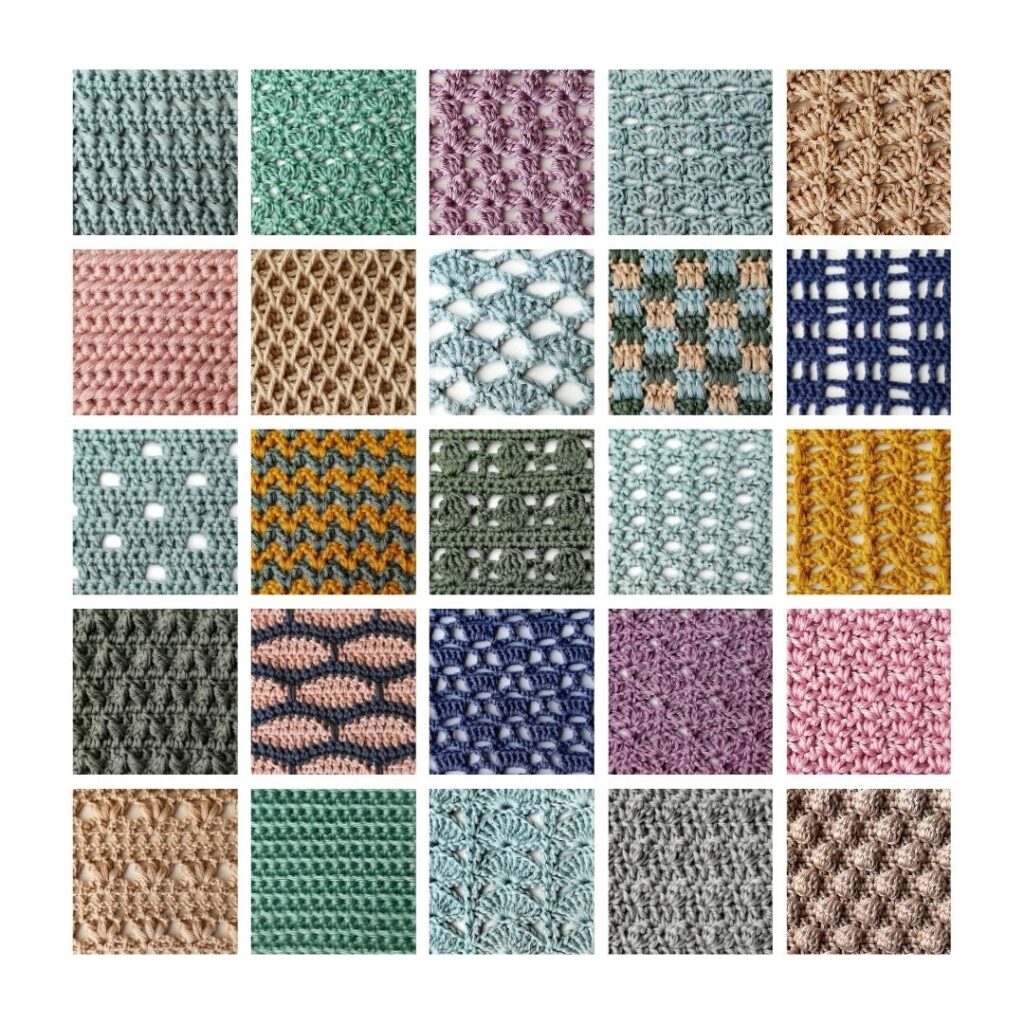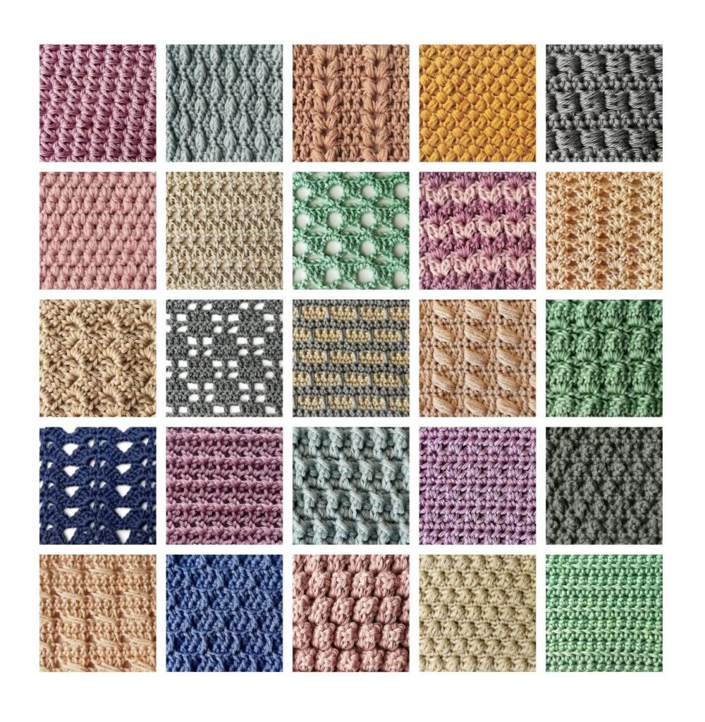 This collection includes single-color and multi-color stitches, as well as lacy and more dense stitches that can be used for a wide range of projects.