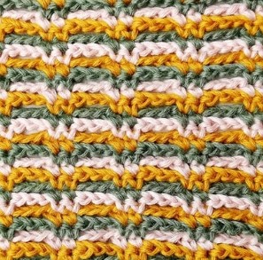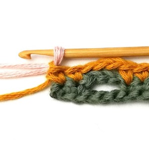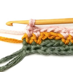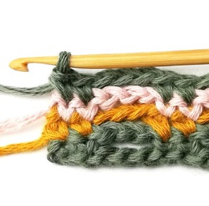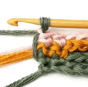 22. For the rest of the pattern repeat row 2 changing yarn color every row from eucalyptus to curry, from curry to dusty pink, from dusty pink to eucalyptus.