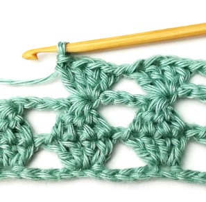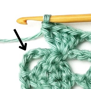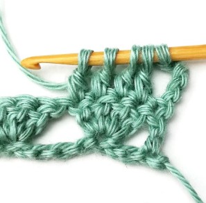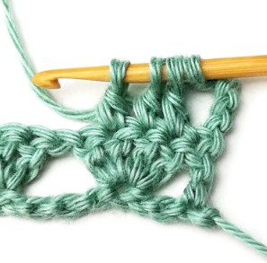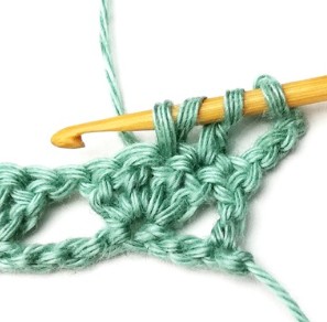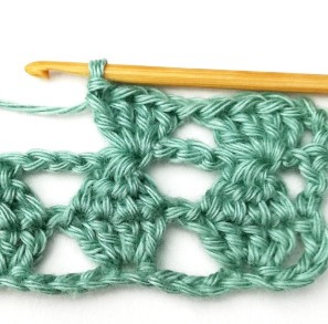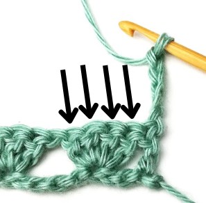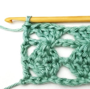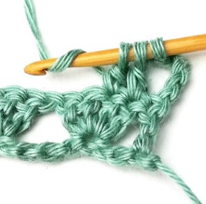 6. Then repeat. Chain one, skip four stitches and make four double crochets in the next stitch.