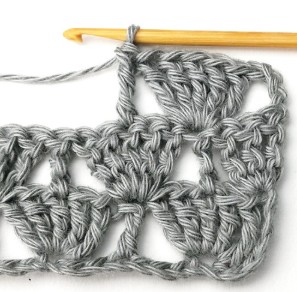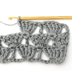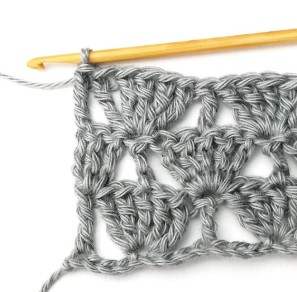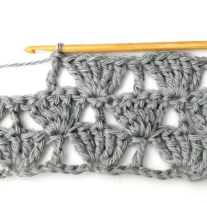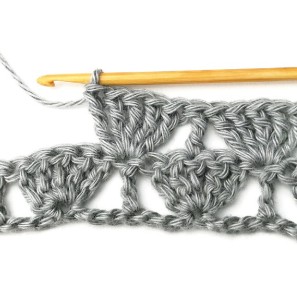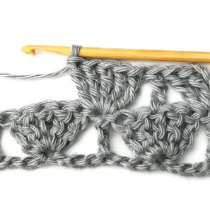 23. Then repeat. Skip two stitches and make five treble crochets in the next stitch.