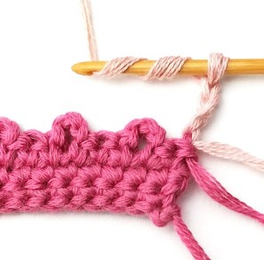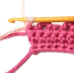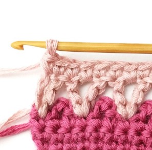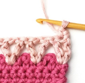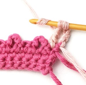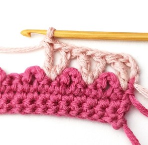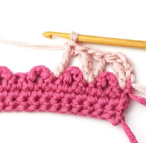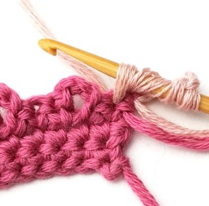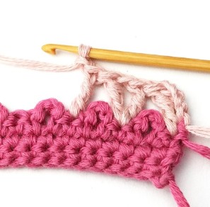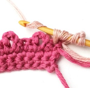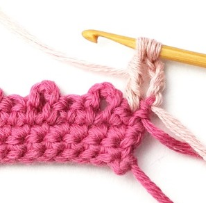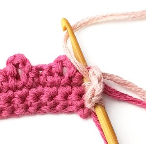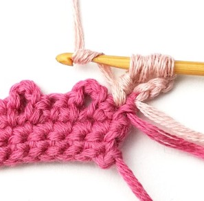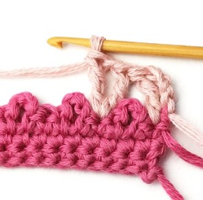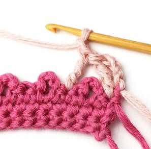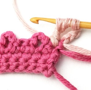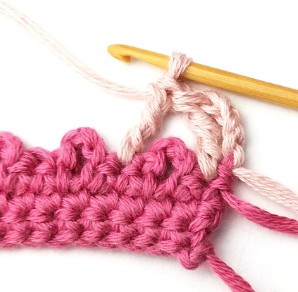 17. Change yarn color to dusty pink. So, chain one with dusty pink yarn.