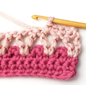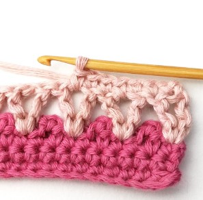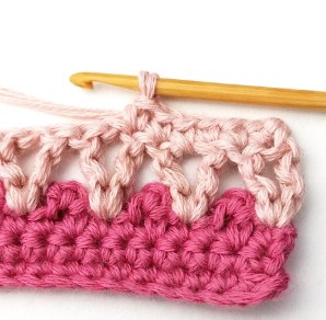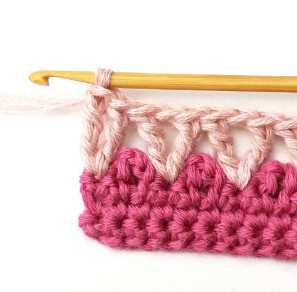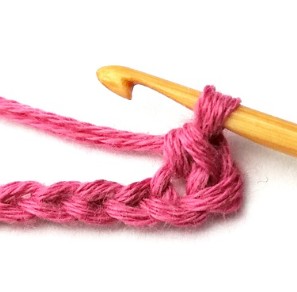 1. Start by chaining a multiple of three plus two with dusty tulip yarn. You will start working in the second chain from your hook.