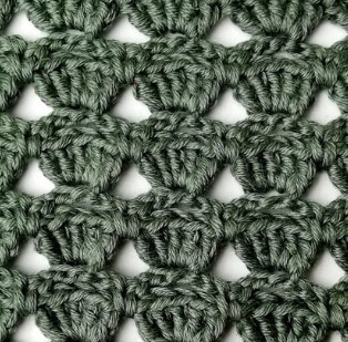 5. Continue working in the same way until the end of the row: skip four stitches and make five double crochets in the next stitch.