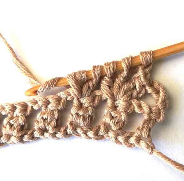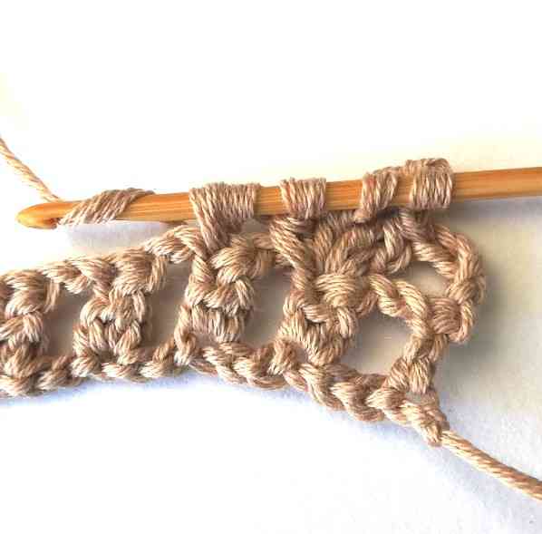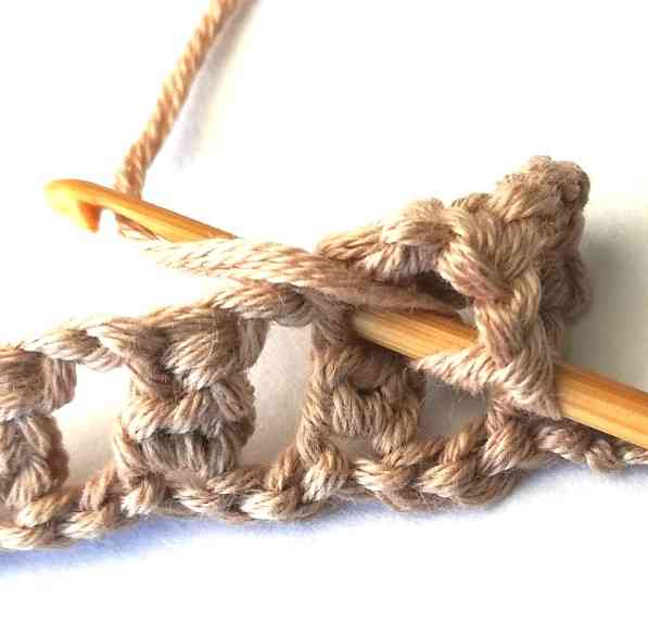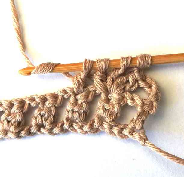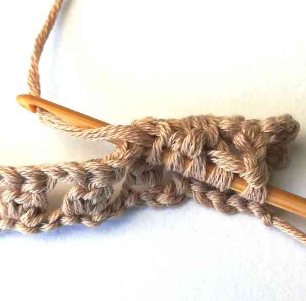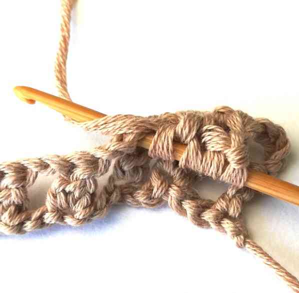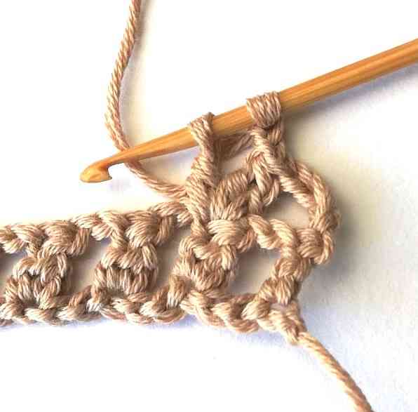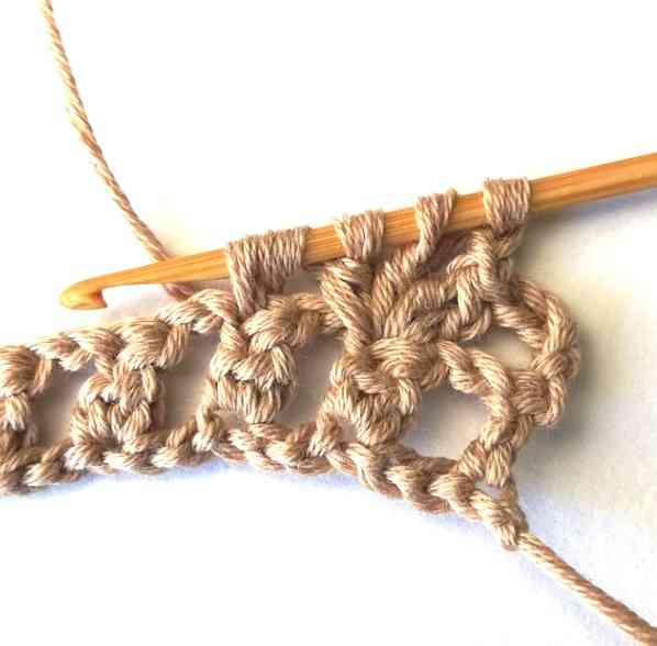 17. Continue working in the same way until the end of the row until you have three stitches left. Then chain two.
