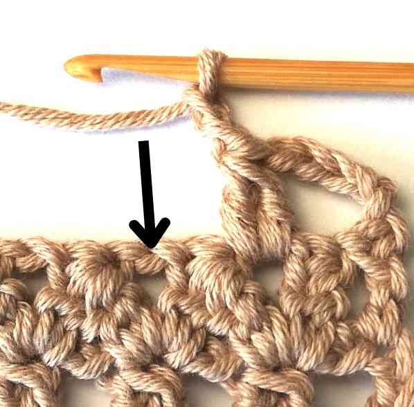 57. At the end of the row when you make the last double crochet two together, chain two.