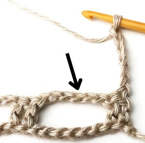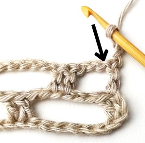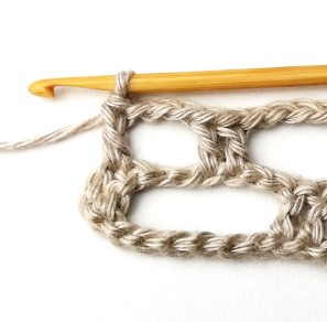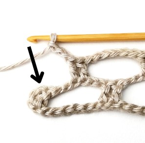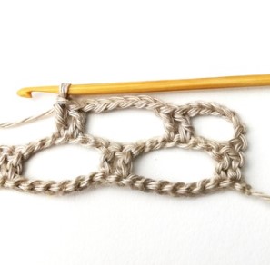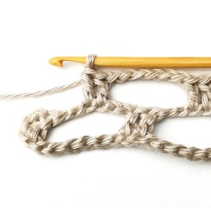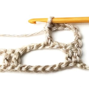 15. Then repeat: chain six and make two double crochets in the third and the fourth chain of the next chain six.