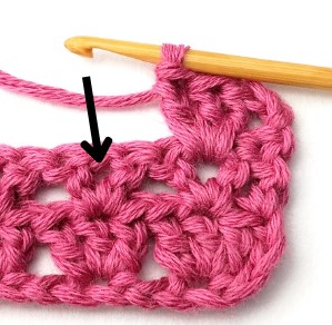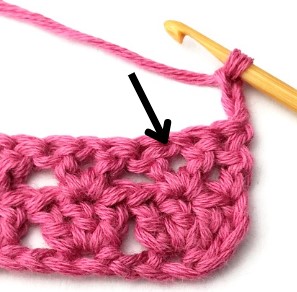 12. Skip two stitches and in the next stitch make a double crochet, chain one and another double crochet.
